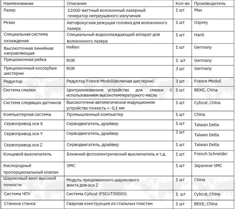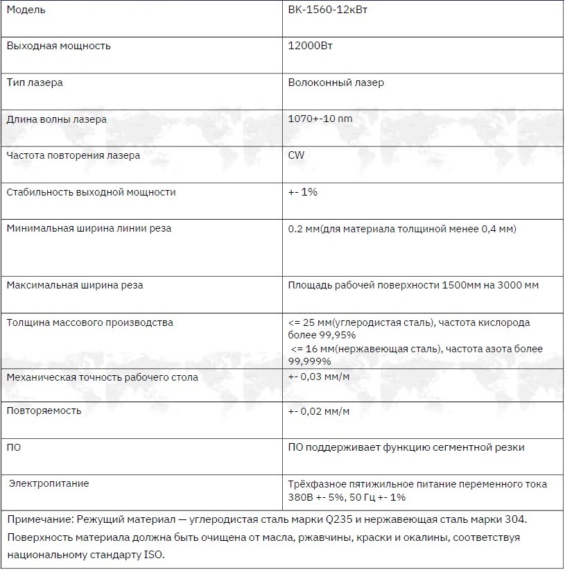 Мощность лазера - 6000 Вт Площадь рабочей поверхности - 1500 мм х 6000 мм Минимальная ширина реза - 0,2 мм Максимальная глубина реза - 18 - 50 мм (в зависимости от материала) Механическая точность - 0,03 мм/м Повторяемость - 0,02 мм/м ЧПУ - Cybcut (FSCUT3000S) Режущая голова - MAX